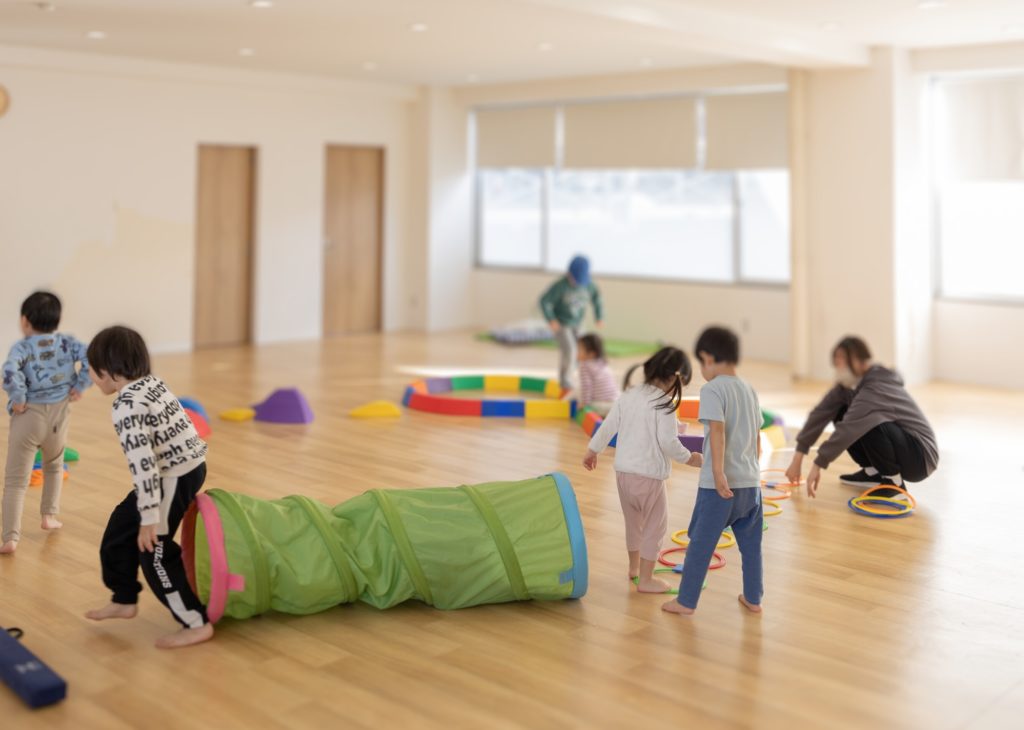 県内最大級の100平方メートル以上ある広々とした訓練ホールでは、様々な運動療育プログラムを伸び伸びと実践♪