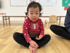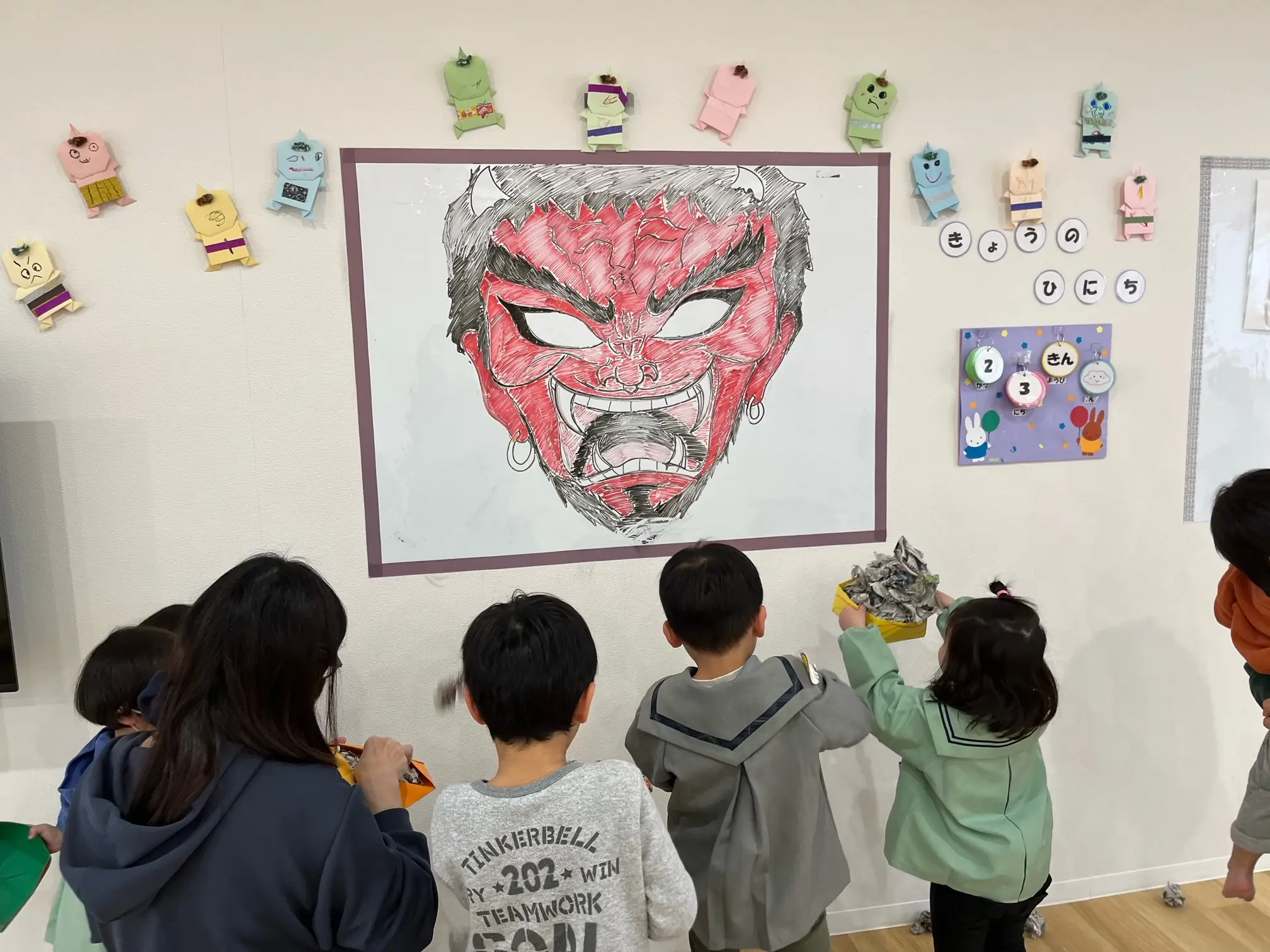 事前に子どもたちと一緒に作った枡と新聞紙を丸めて豆に見立てたものを使って、